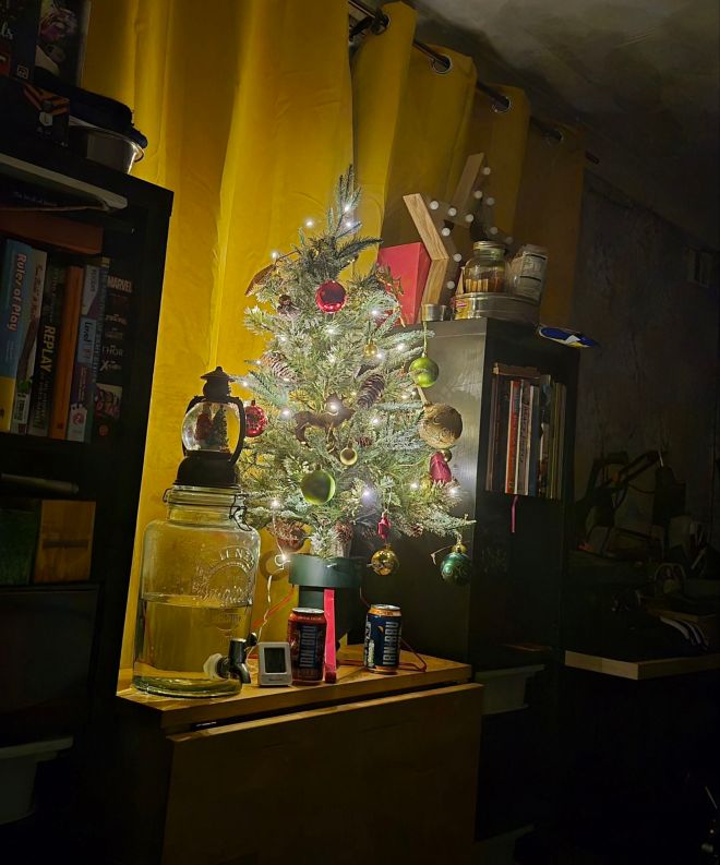 När vi flyttade norrut för två år sedan var vi tvungna att göra oss av med en himla massa saker och bohag. En massiv gran (som börjat se lite maläten ut i mittpartiet om vi ska vara petnoga) får inte riktigt plats i en liten lya utan förråd, så den kunde inte få följa med. Men Trean var fiffig som vanligt och sparade toppen.