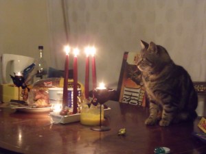 Julkatten Lotus beundrar adventsljusen och suktar efter julskinkan…